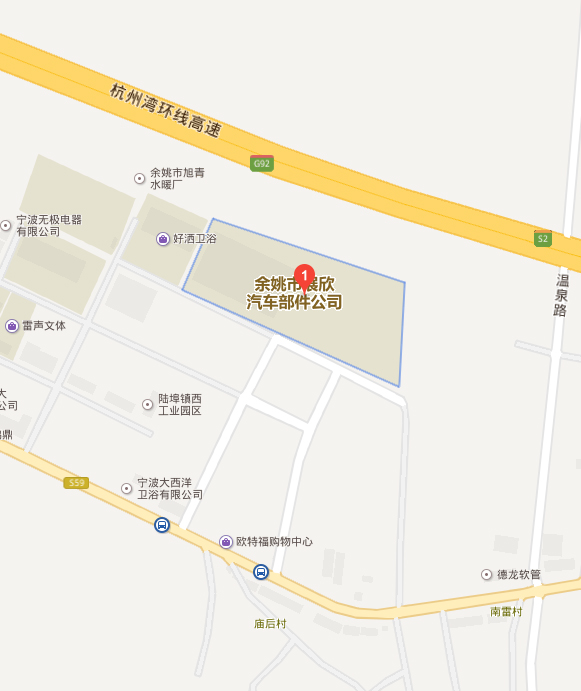 余姚市展欣汽車部件有限公司,地處寧(波)紹(興)平原中心,位于風景秀麗的浙江省余姚市陸埠鎮(zhèn)西工業(yè)園區(qū)。緊靠杭甬高速和蕭甬鐵路,近臨杭州灣跨海大橋,距河姆渡遺址10公里,距寧波櫟社國際機場40公里,距杭州蕭山國際機場80公里,交通便捷。